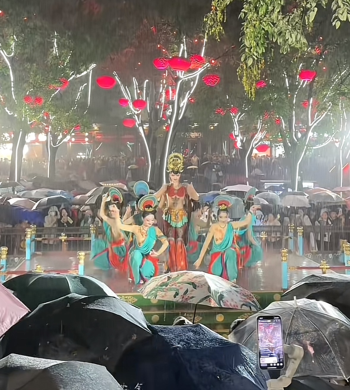 10月14日晚,有众多网友发布视频称,在西安大唐不夜城景区多名身着表演服的景区演员冒雨为现场观众表演。视频中演员们舞姿优雅,现场有大量撑伞观众观看演出。