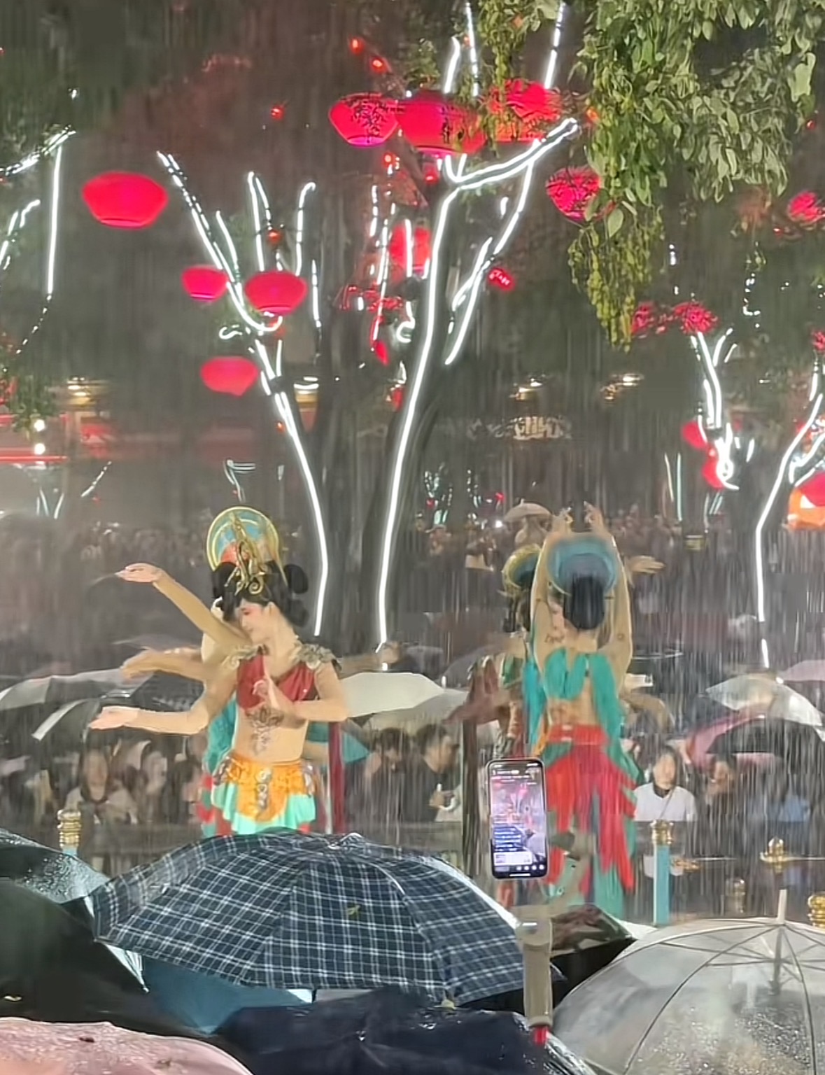 景区冒雨表演的演员们也受到了广大网友的点赞,有网友表示,“为我们敬业的颜值演员点赞!”也有网友点赞,“太不容易了,这就是西安文旅的温度。”