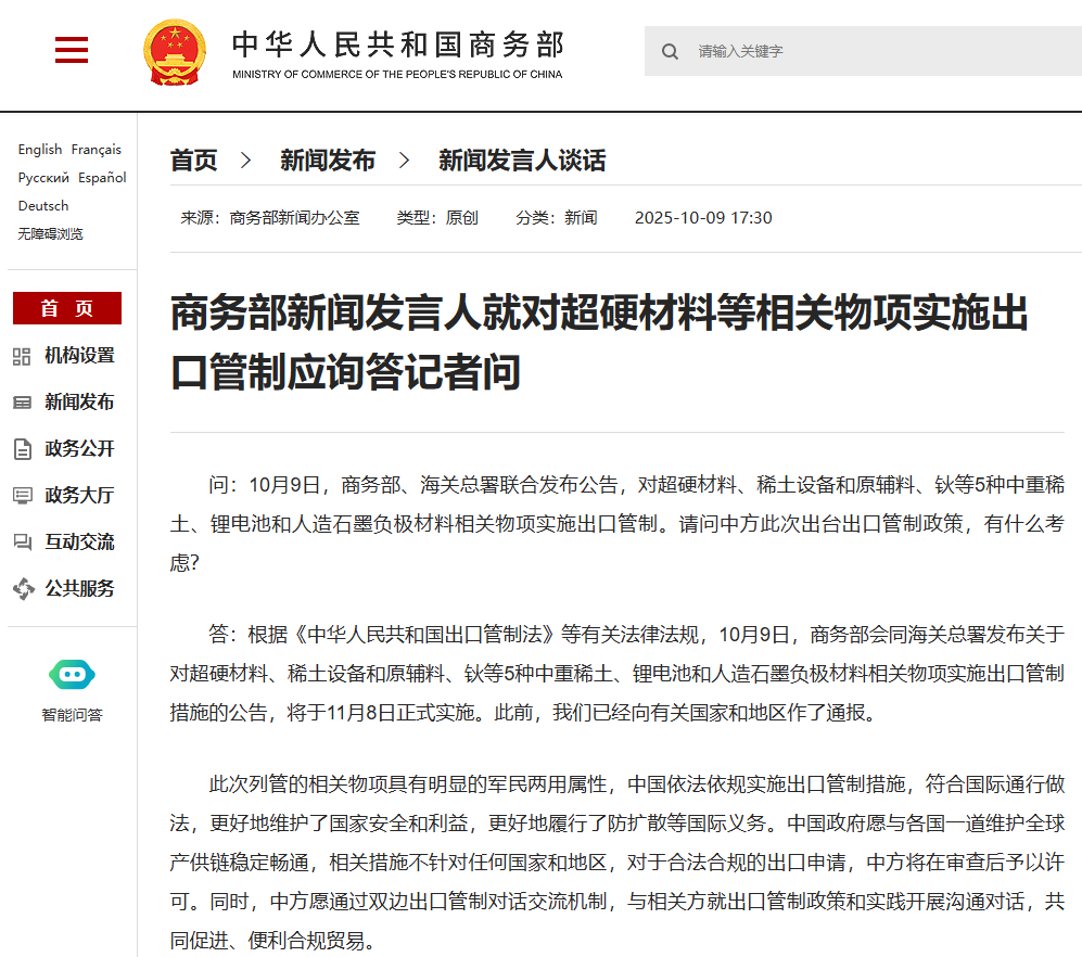 问:10月9日,商务部、海关总署联合发布公告,对超硬材料、稀土设备和原辅料、钬等5种中重稀土、锂电池和人造石墨负极材料相关物项实施出口管制。请问中方此次出台出口管制政策,有什么考虑?